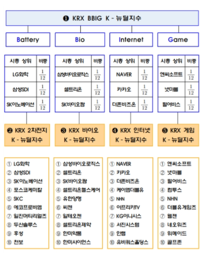 뉴딜 지수는 Battery, Bio, Internet, Game 등 4가지 지수에 비중을 나누어서 투자하는 것으로 보입니다.
