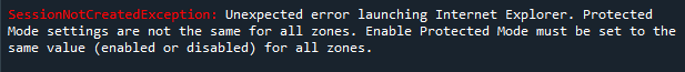 "SessionNotCreatedException: Unexpected error launching Internet Explorer. Protected Mode settings are not the same for all zones. Enable Protected Mode must be set to the same value (enabled or disabled) for all zones."