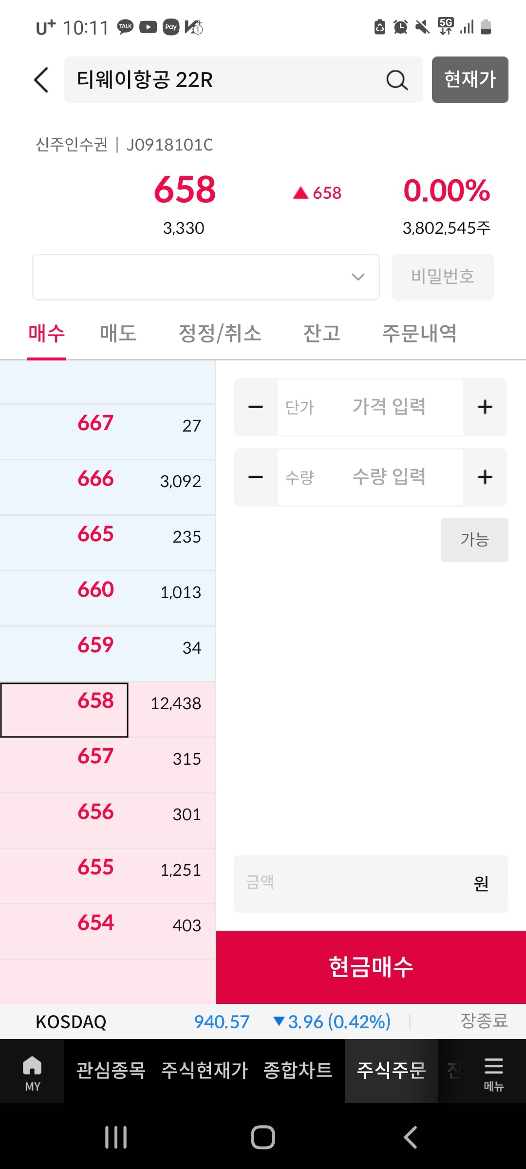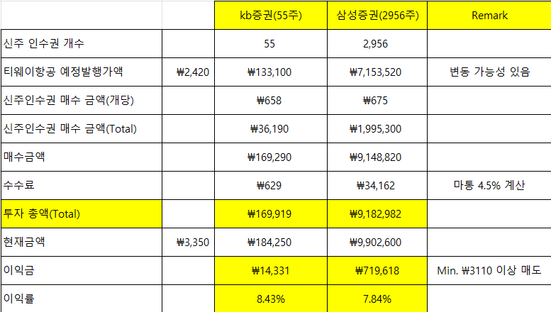 티웨이항공이 신주인수권 거래 기간이라 계산 후 투자를 하기로 했다.