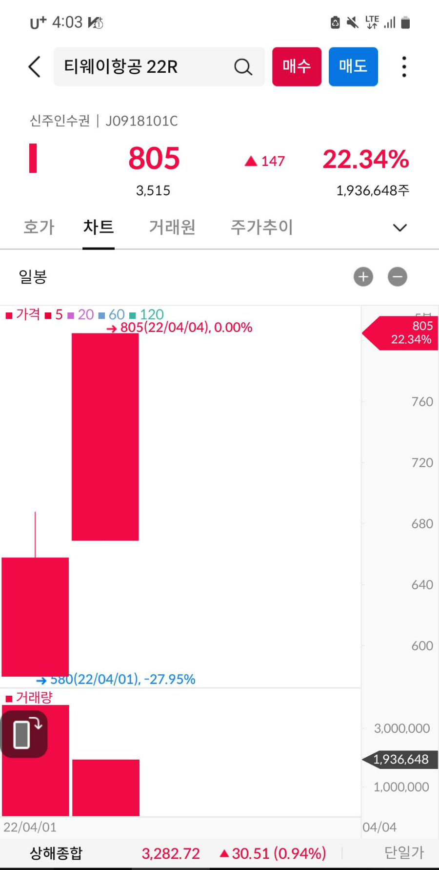 2022년 4월 4일 (월) 티웨이항공의 신주인수권 가격이 급등을 해버렸다.