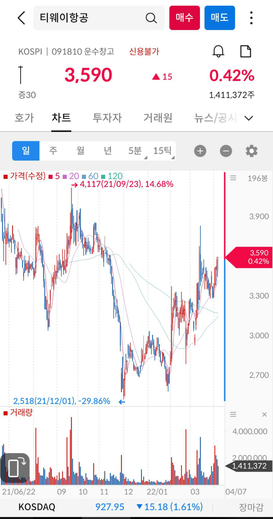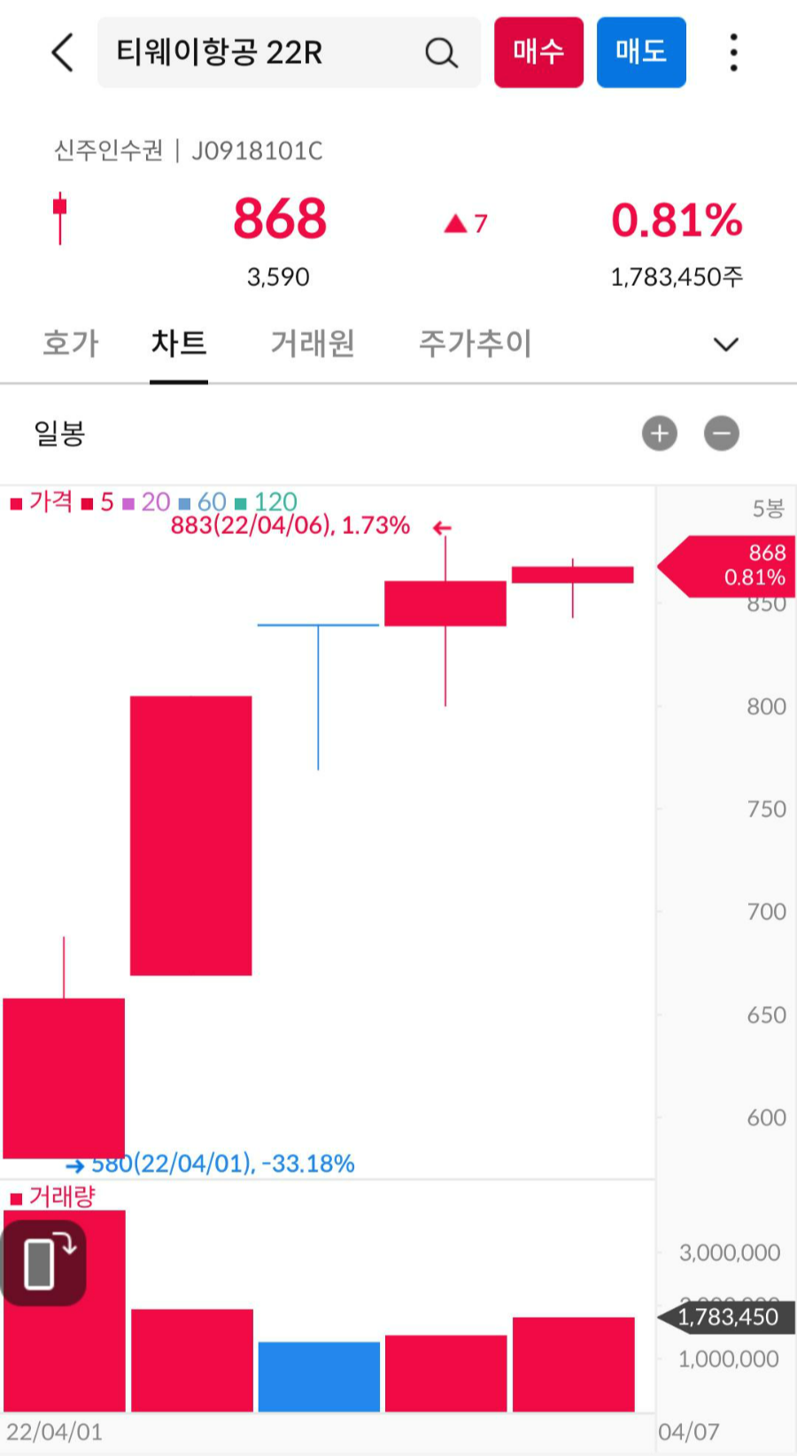 | 티웨이항공 신주인수권 분할매도 - 가격 급등 기록 (0) | 2022.04.05 |