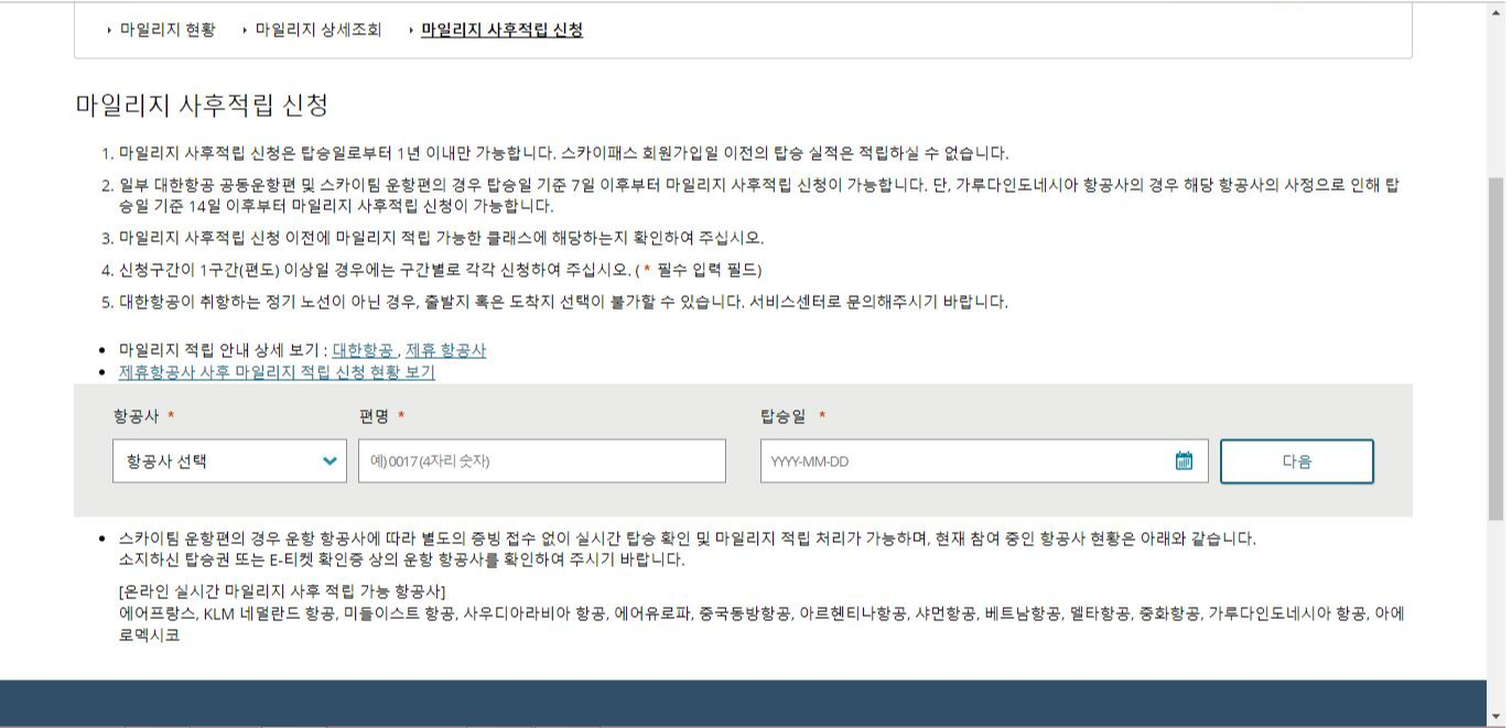 대한항공 마일리지 적립 여행지 출발전 확인 사항 사후 적립 본문