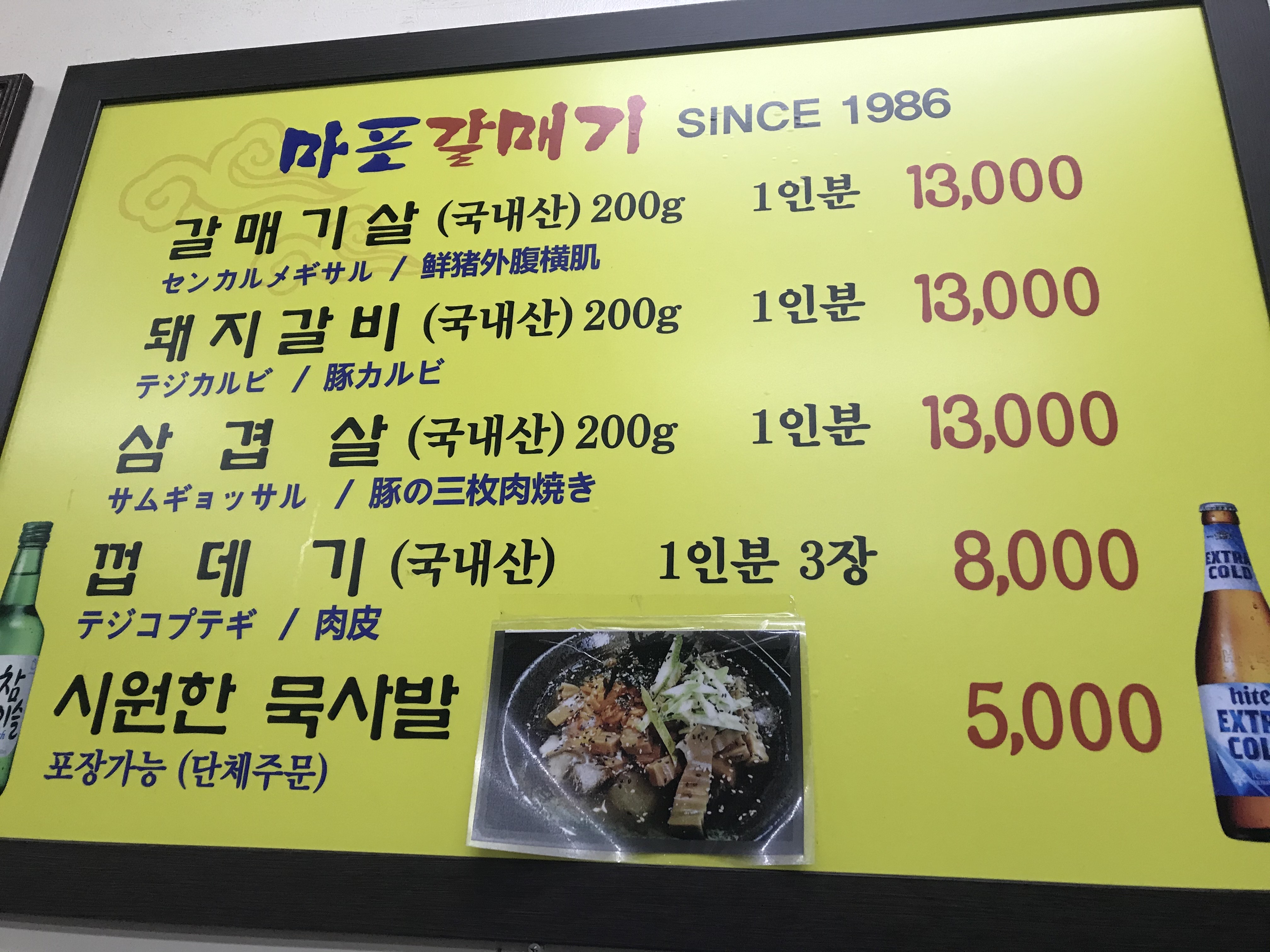 메뉴판도 옛날 모습처럼 투박하였고 대부분 갈매기살을 시켜서 먹습니다. 간혹 가다가 껍데기, 돼지갈비를 드시는 분들도 계셨는데 그래도 갈매기집 답게 갈매기살이 유명합니다.