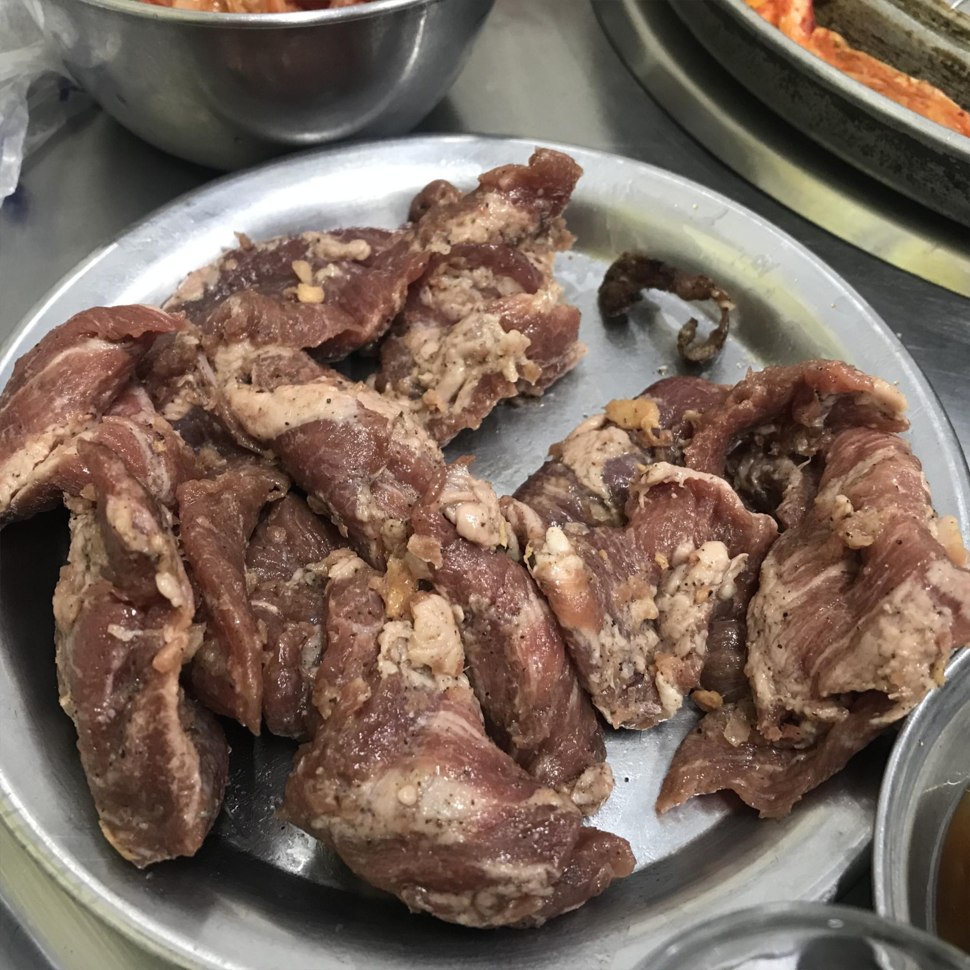 갈매기살을 시키니 이렇게 나왔습니다. 처음 저도 비쥬얼을 보고서는 살짝 놀랬지만 정말 보기와는 다르게 너무 짜지도 달지도 않게 맛이 있었습니다. 하지만 정말 옛날 느낌의 식당과 옛날 느낌의 고기라서 깔끔한 분위기를 좋아하시는 분들에게는 맞지 않을 것 같습니다.