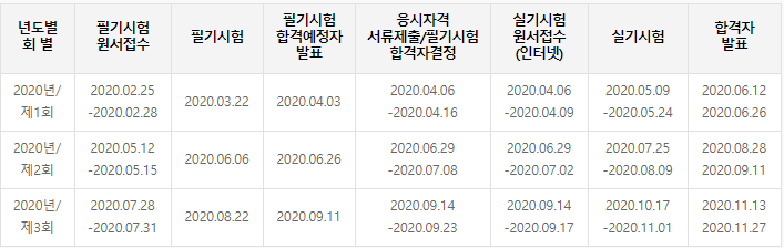 위의 표는 올해 기사 시험일정입니다. 기존의 시험일자들에 비해서 조금 더 느린 양상을 보이고 있습니다. 특히 1차 필기 이후 실기 시험까지 여유로운 기간이니 이번 기회에 다들 자격증을 취득하시길 바랍니다.